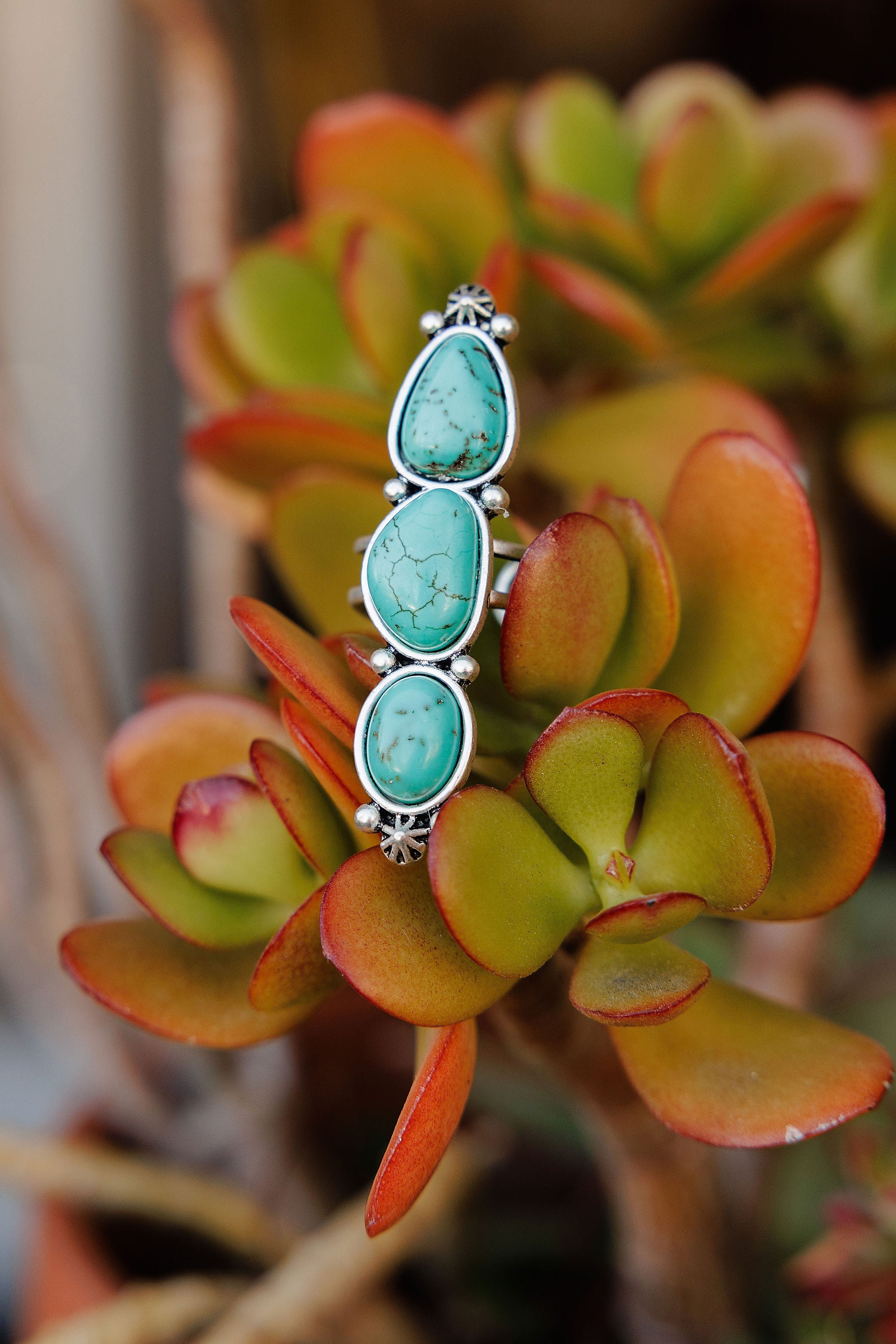 This turquoise ring is a bold nod to desert skies and vintage silver work. Set in a handcrafted sterling silver band and framed with a beaded edge, the natural turquoise stones carries earthy veins that make each piece one-of-a-kind.